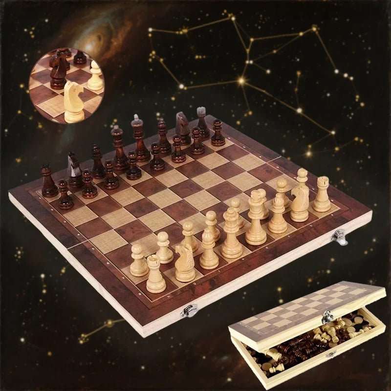 3in 1 Portable Travel Chess Checker Backgammon, Folding Storage Wooden Chess Set, International Checkers Board Game Kids Adults